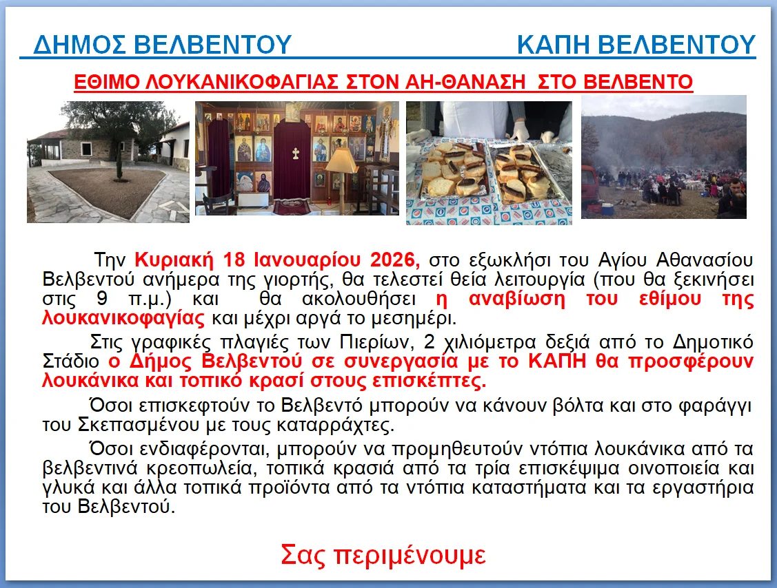 Την Κυριακή 18 Ιανουαρίου 2026, στο εξωκλήσι του Αγίου Αθανασίου Βελβεντού ανήμερα της γιορτής, θα τελεστεί θεία λειτουργία (που θα ξεκινήσει στις 9 π.μ.) και θα ακολουθήσει η αναβίωση του εθίμου της λουκανικοφαγίας και μέχρι αργά το μεσημέρι.