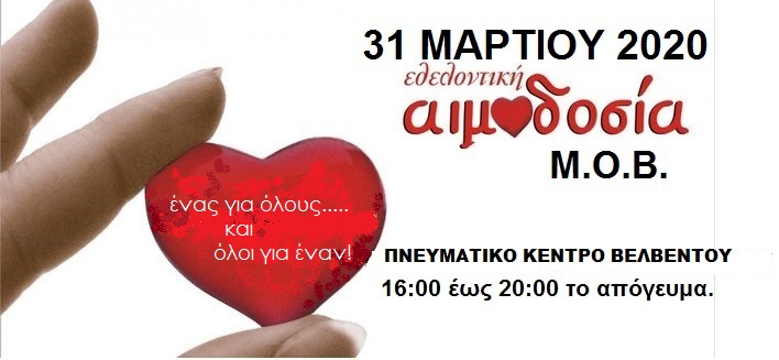 Η ομάδα εθελοντών αιμοδοτών του Μορφωτικού Ομίλου Βελβεντού σε συνεργασία με την κινητή μονάδα αιμοληψίας του Μαμάτσειου Νοσοκομείου Κοζάνης, διοργανώνουν εθελοντική αιμοδοσία την Τρίτη 31 Μαρτίου 2020 από τις 16:00-20:00, στο Πνευματικό Κέντρο Βελβεντού.
